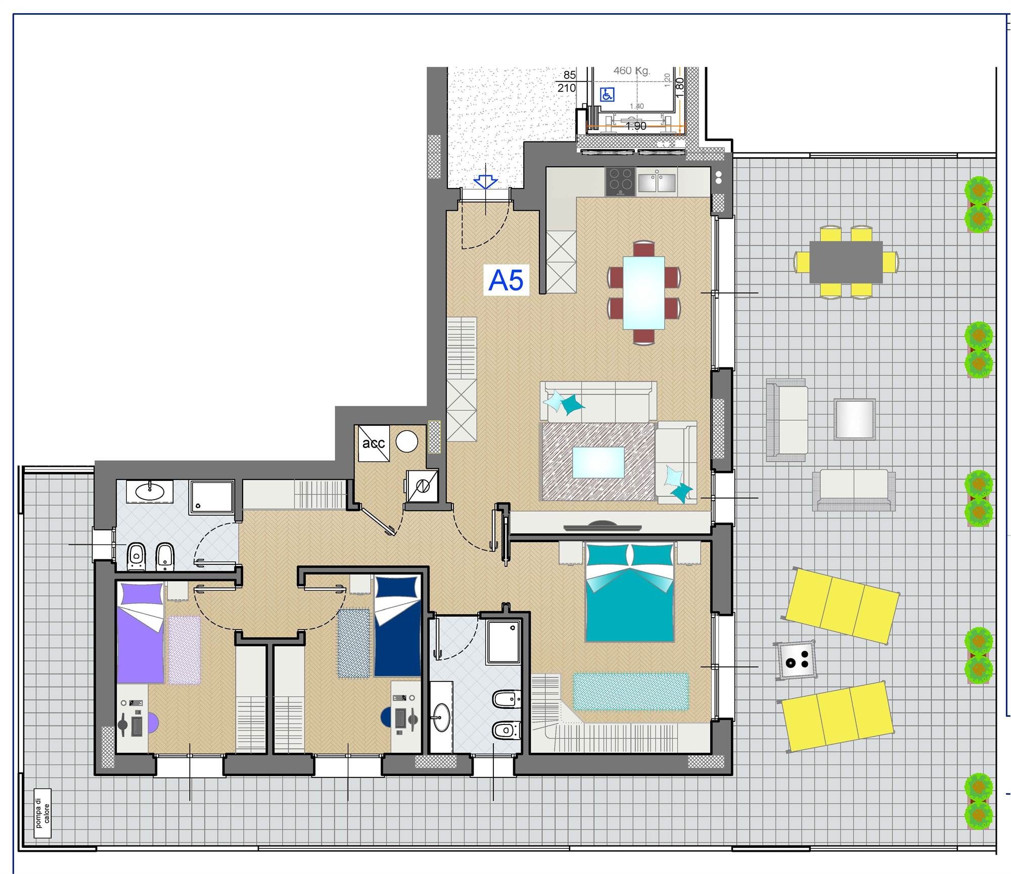In centro Barlassina. in nuovissima mini-palazzina di sole 8 unità abitative, proponiamo trilocali e quadrilocali, in classe energetica A4. Tre piani fuori terra con ascensore, al piano interrato le cantine, al piano terra ingresso e 2 corselli box. Per l’acquisto in questa residenza c’è l’opportunità di usufruire di una detrazione fiscale fino ad un massimo di 48.000 €. L’edificio sarà realizzato in osservanza a quanto previsto dalle normative vigenti in materia di isolamento termico, acustico e di requisiti impiantistici delle abitazioni ed in rispondenza alle prescrizioni in materia di contenimento del consumo energetico. I materiali utilizzati e la tipologia degli impianti garantiranno un elevato confort abitativo ed una riduzione del consumo energetico. Consegna prevista entro Febbraio 2026. L'appartamento A5 dispone di un ampio soggiorno con cucina a vista, tre camere, due bagni, rispostiglio, grande terrazzo sul soggiorno di circa 70 mq comunicante col balcone a girare sugli altri lati d'affaccio. Cantina inclusa. Possibilità di box singolo o doppio a scelta. Ottimo capitolato: Struttura in cemento armato secondo normativa antisismica con muri di tamponamento in laterizio Acustic block e cappotto termico. Ascensore. Sistema di riscaldamento a pavimento a pannelli radianti con impianto autonomo a pompa di calore elettrica aria-acqua. L’impianto sarà inoltre dotato di un bollitore ad accumulo per acqua calda sanitaria. Scalda-salviette ad integrazione nei bagni. Impianto VMC ventilazione meccanica controllata autonoma a doppio flusso con recupero di calore, consentirà un ricambio continuo e controllato dell'aria evitando dispersioni e garantendone la salubrità. Impianto fotovoltaico autonomo per ogni appartamento con potenza di 2 KW. Impianto elettrico tradizionale con predisposizione per un'eventuale domotica, serie Bticino Living-light. Videocitofono, predisposizione fibra ottica, predisposizione impianto d’allarme. Serramenti in legno a doppia guarnizione laccato bianco, completi di vetrocamera a basso emissivo antisfondamento. Tapparelle motorizzate in pvc serie pesante o alluminio, cassonetti e spalle coibentati. Porta blindata antieffrazione. L’autonomia completa degli impianti di riscaldamento e fotovoltaico consentirà delle spese condominiali ridotte.
