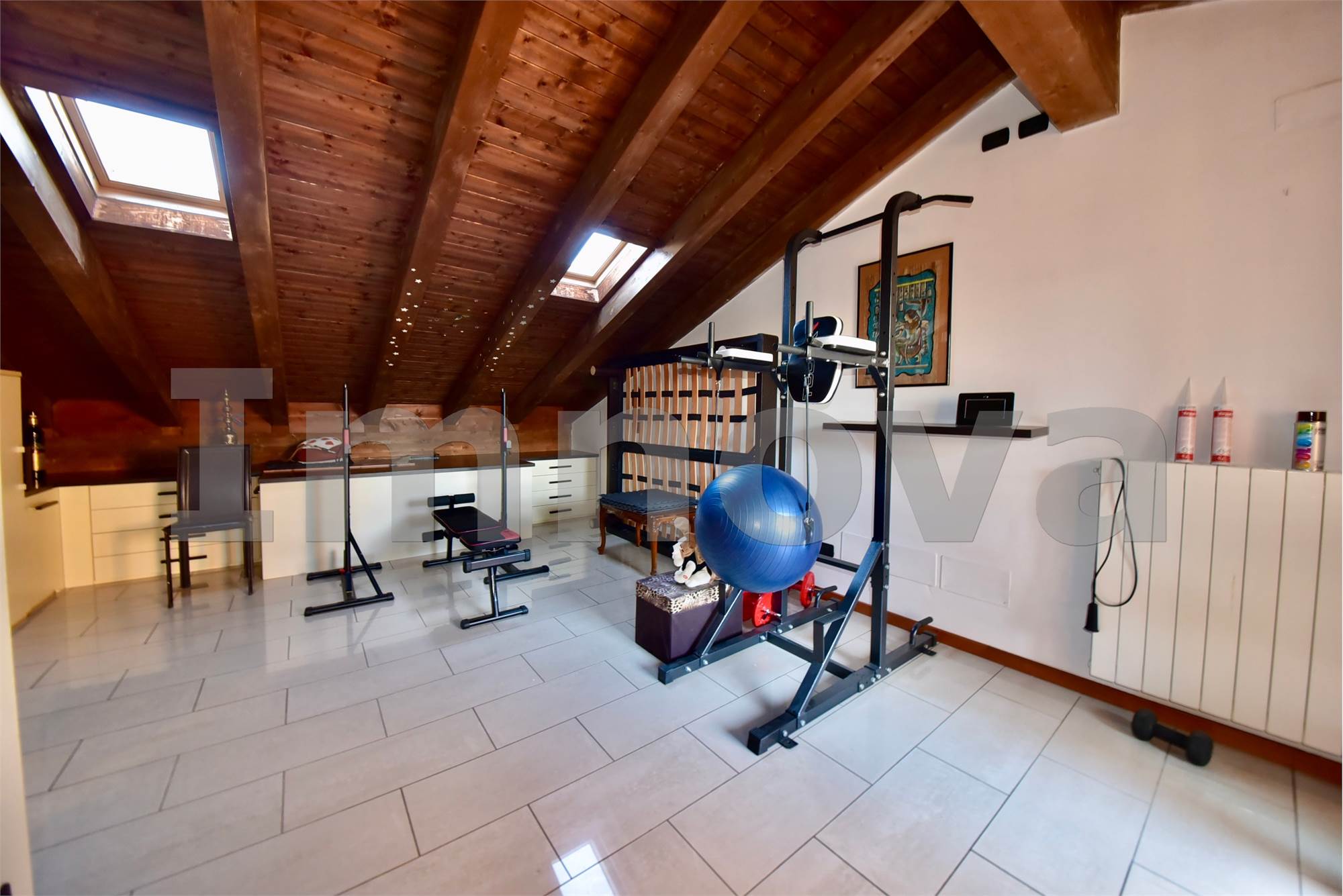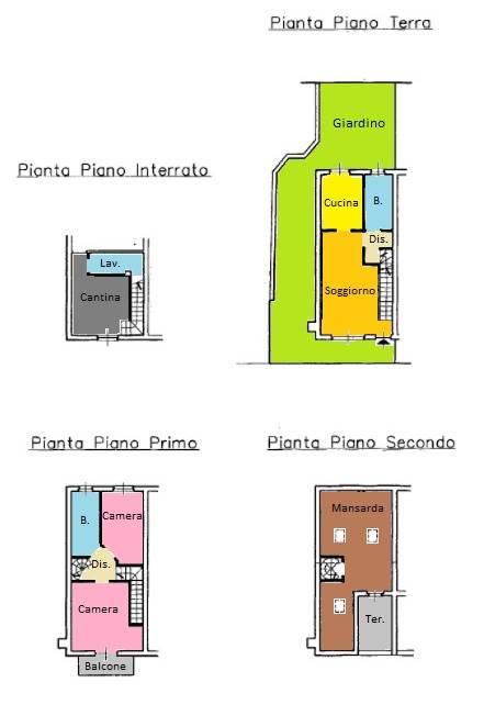 La soluzione con ingresso indipendente si sviluppa al piano terra con soggiorno, cucina abitabile con sfogo diretto sul giardino privato piastrellato e bagno; tramite la scala lineare si raggiunge la zona notte con le due camere da letto, una delle quali servita da balcone e secondo bagno. Completano l' abitazione la mansarda con travi a vista e terrazzino e la taverna con lavanderia e accesso diretto al box doppio.